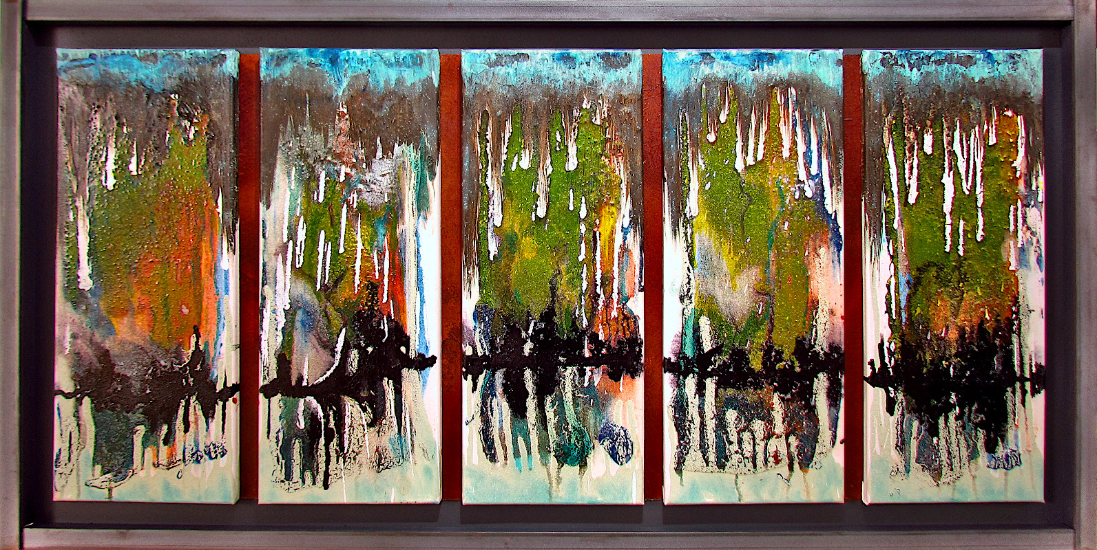 2025Öl, Acryl, Metall, HolzThema: Chaos 311Der Park war voller Gelächter und alle jubelten nach der Flut. Das irdische Paradies ist gefallen.